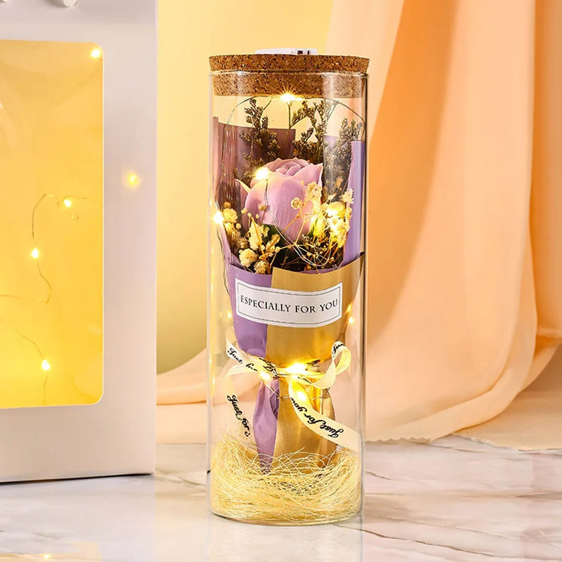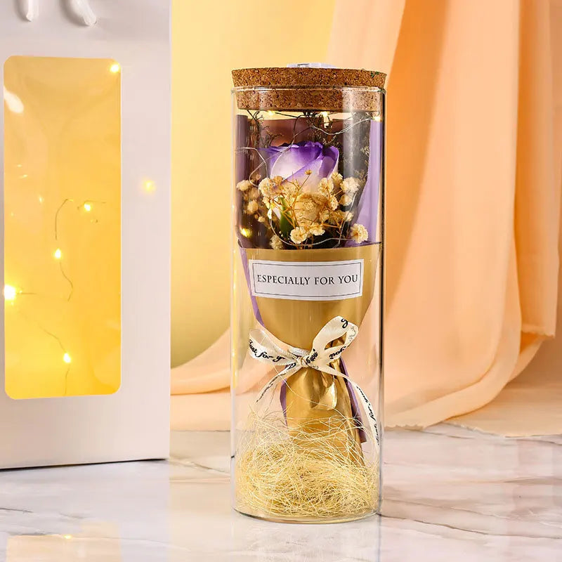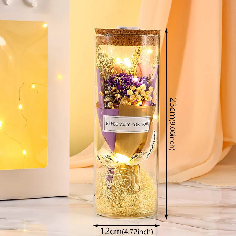 Introducing the eternal flower with LED light, a stunning and romantic gift that expresses gratitude, blessings, love, and romance. This exquisite glass wishing bottle design features eternal roses and LED lights, creating a bright and warm illumination that adds a touch of romance to any space.